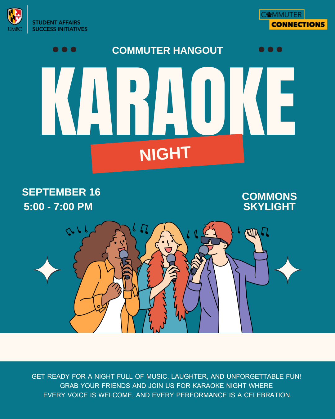 Take a break and join Commuter Connections and Student Affairs Success Initiatives for a fun night of music, laughter, and community! Whether you’re ready to grab the mic and belt out your favorite songs or just want to cheer on your friends, Karaoke Night is the perfect way to connect with other students. Come enjoy good vibes, tasty food, and plenty of unforgettable performances.