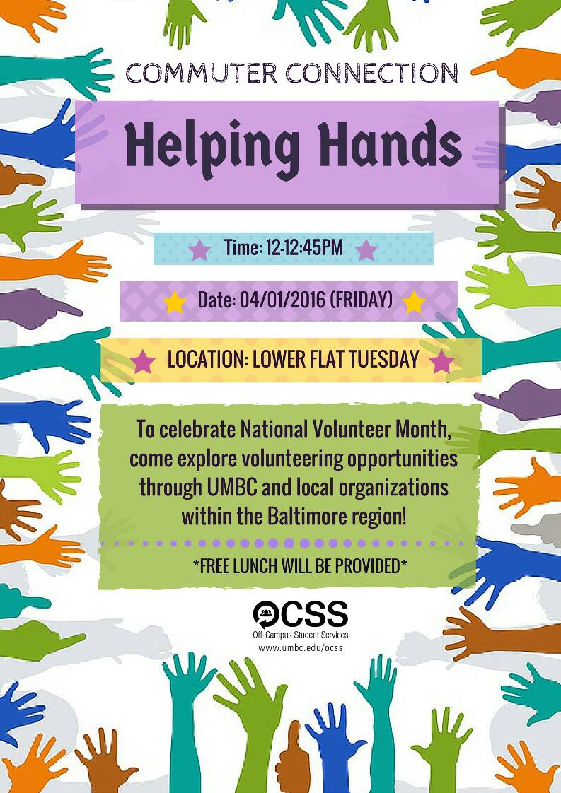 Come join us this Friday to celebrate National Volunteer Month! We will have tons of information on volunteering opportunities. It will be a great time to meet fellow commuters and transfer students, mingle, and have some lunch. You won't want to miss it!